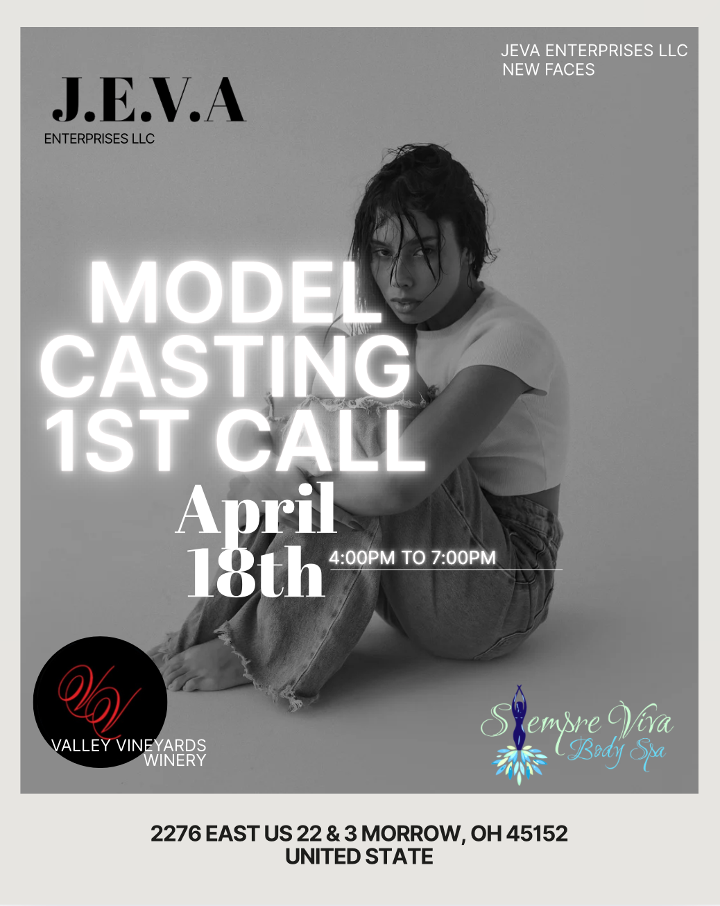 The purpose of this event is to discover new talent and select models to collaborate with JEVA Enterprises LLC in upcoming photoshoots, creative projects, and promotional campaigns. Selected participants may have the opportunity to represent the brand in future content and marketing initiatives.